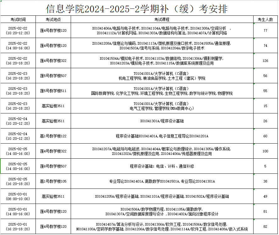 根据本学期教务处补(缓)考总体安排,麻豆tv 开设课程的补(缓)考安排已上传学校教务系统,请各位考生及时进入教务系统查看具体考试安排。请考生务必携带身份证和学生证(或一卡通)参加考试。