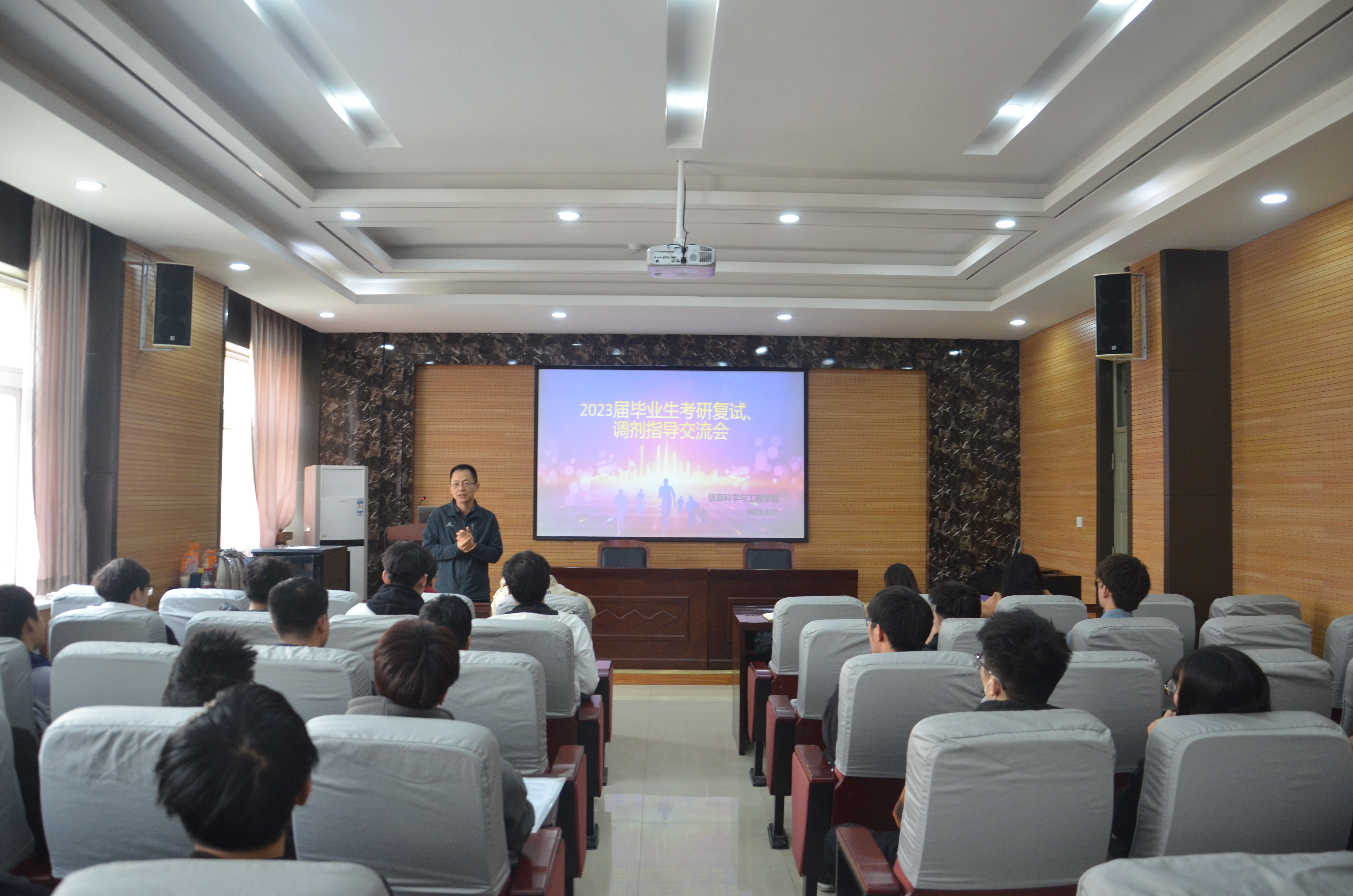 在6228会议室举办了2023届毕业生考研复试调剂指导交流会。会议由张转婷老师主持,学院学科办主任朱春华、电信系教师吕宗旺主讲,全体毕业班辅导员和考研学生参会。