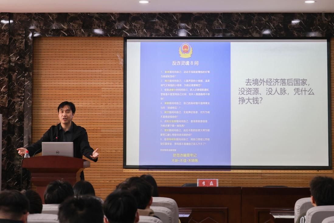 讲座中,李磊结合当前电信网络诈骗案件高发态势,以"识诈、防诈、反诈"为主线,通过典型案例分析、诈骗手段揭秘、情景模拟互动等形式,系统讲解了刷单返利、游戏充值、冒充客服退款等10类高发诈骗类型的作案特点和防范技巧。针对大学生群体易受骗的类型,通过真实案例复盘,重点剖析了诈骗分子的心理话术和技术手段,让参与讲座的同学们深刻意识到,诈骗行为并非遥不可及,它们可能就潜伏在我们日常生活的每个角落。这种生动具体的讲解方式,极大地增强了同学们对诈骗行为的识别能力和防范意识。通过这场讲座,同学们纷纷表示受益匪浅,对电信网络诈骗有了更深刻的认识和了解,也更加坚定了在日常生活中防范诈骗的决心。