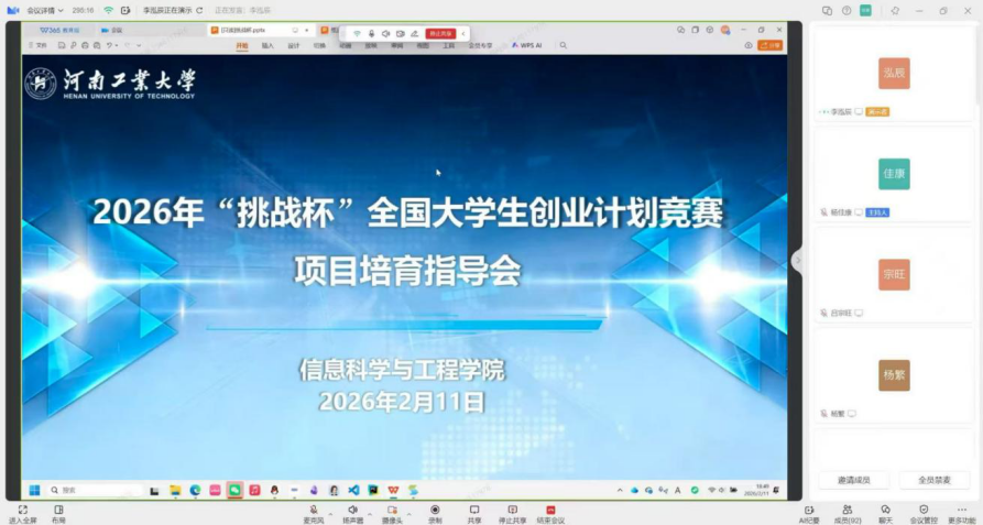 组织召开线上项目培育指导会。学院党委副书记魏雪芹、学院创新创业办公室主任吕宗旺、辅导员杨繁以及参赛学生代表参会,会议由杨繁主持。