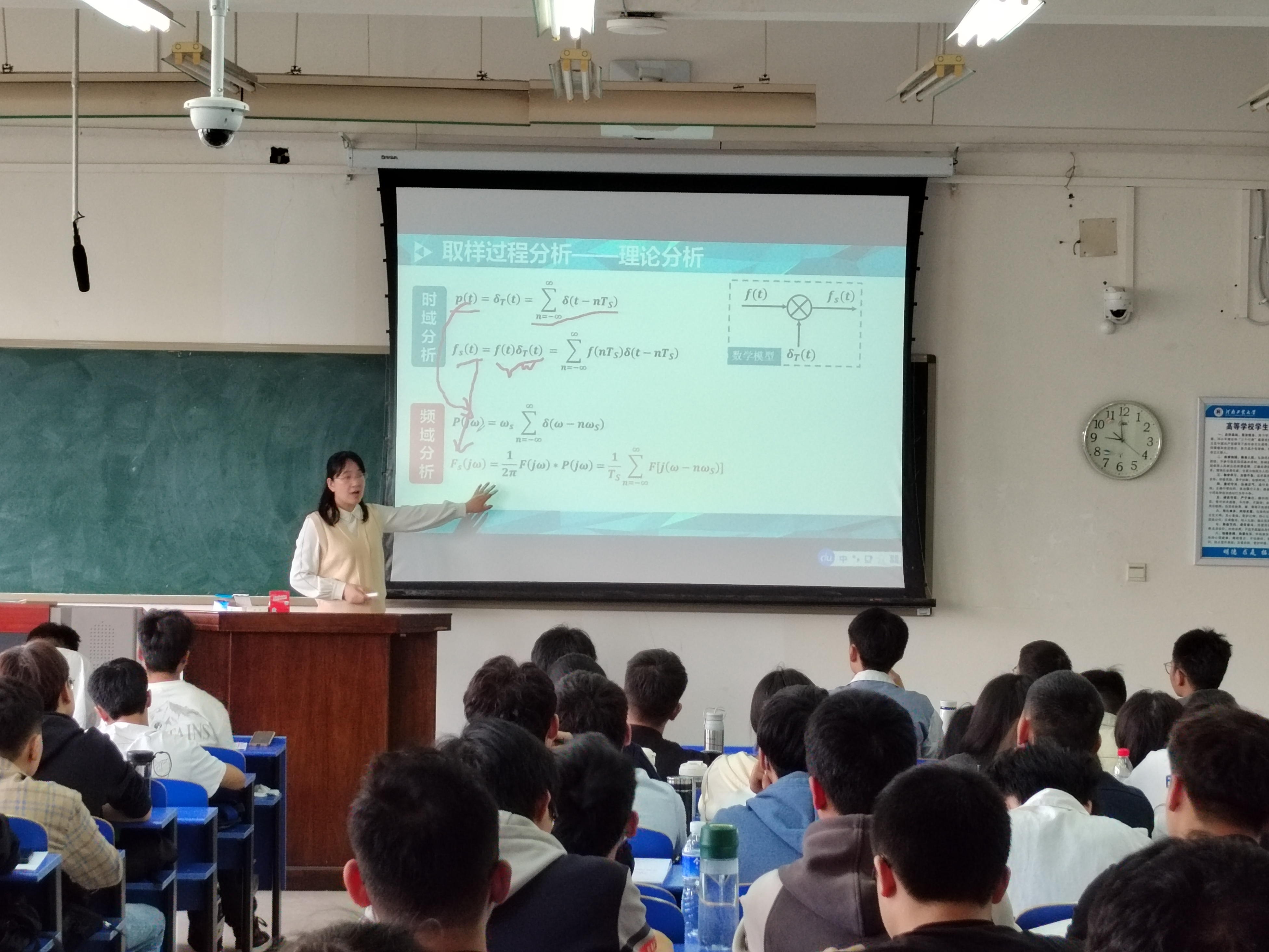 示范课上,付麦霞老师首先回顾了上节课的内容,然后结合实践为学生们讲解了“取样定理”的课程内容,从取样的概念、取样过程分析、取样定理、应用举例、总结与作业5个方面详细讲解了重点和难点知识。课堂上引入学习通在线讨论互动、随机抽取学生回答问题等教学方式,激发了学生的学习兴趣,收到了良好的教学效果。