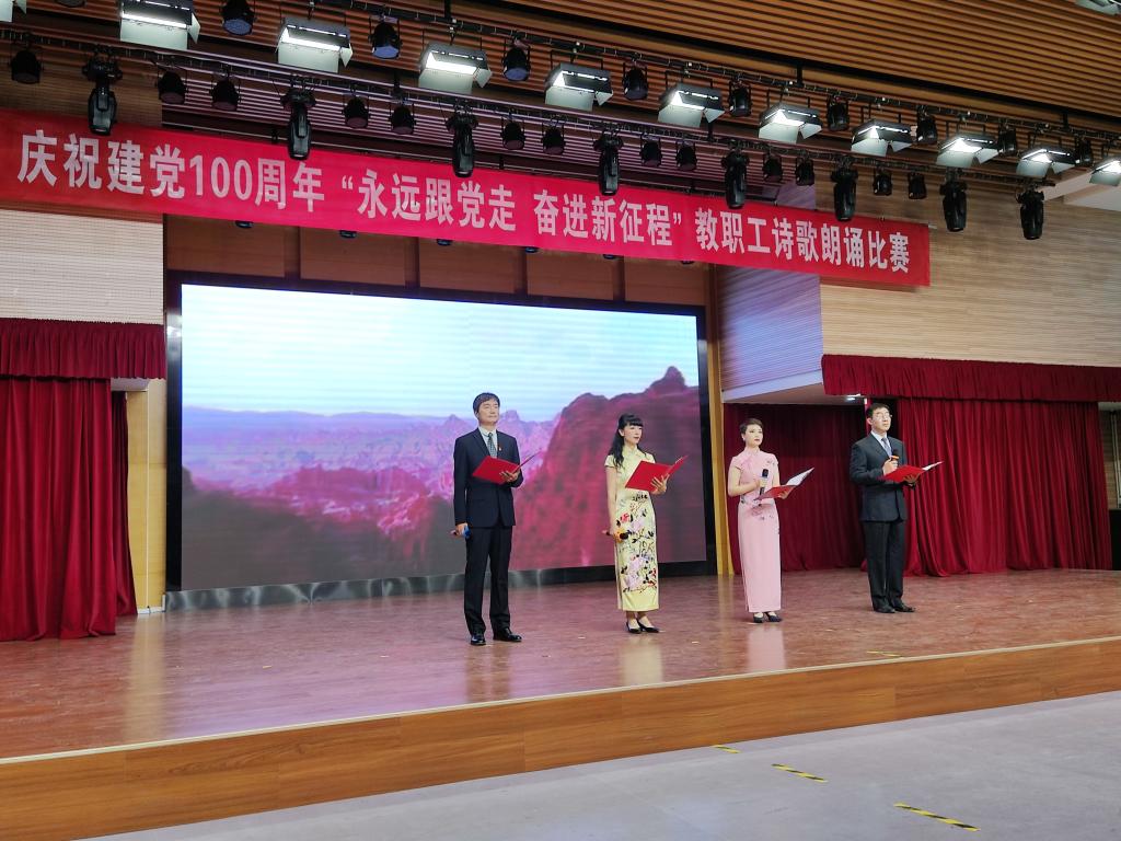 为庆祝中国共产党成立100周年,由校工会主办,校党委宣传部、校团委、信息化管理中心、环境工程学院和新闻与传播学院协办的“永远跟党走奋进新征程”教职工诗歌朗诵比赛于2021年06月22日下午在学校25201演播厅举行,全校共29个代表队参加了比赛。学校相关部门领导及专家评委到比赛现场进行了观摩、打分及颁奖。