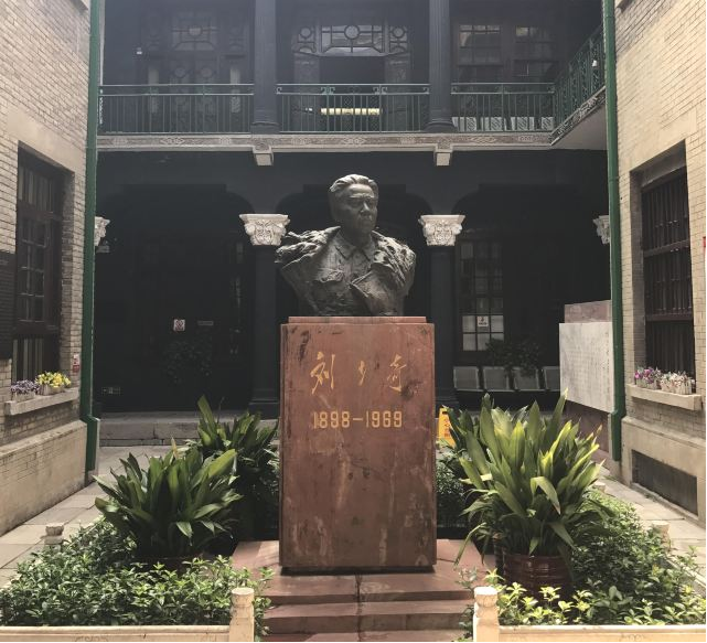 “刘少奇在开封陈列馆(逝世旧址)”位于开封市北土街十号院,现在被定为河南省重点文物保护单位和中小学德育基地。陈列馆座西朝东,大门上方馆名《刘少奇在开封陈列馆》为薄一波题写。前院南北两侧墙上有大型碑刻,分别镌刻有刘少奇《共产党员的修养》手稿局部和邓小平、陈云、李先念、彭真等人的题词。陈列馆照片如下所示: