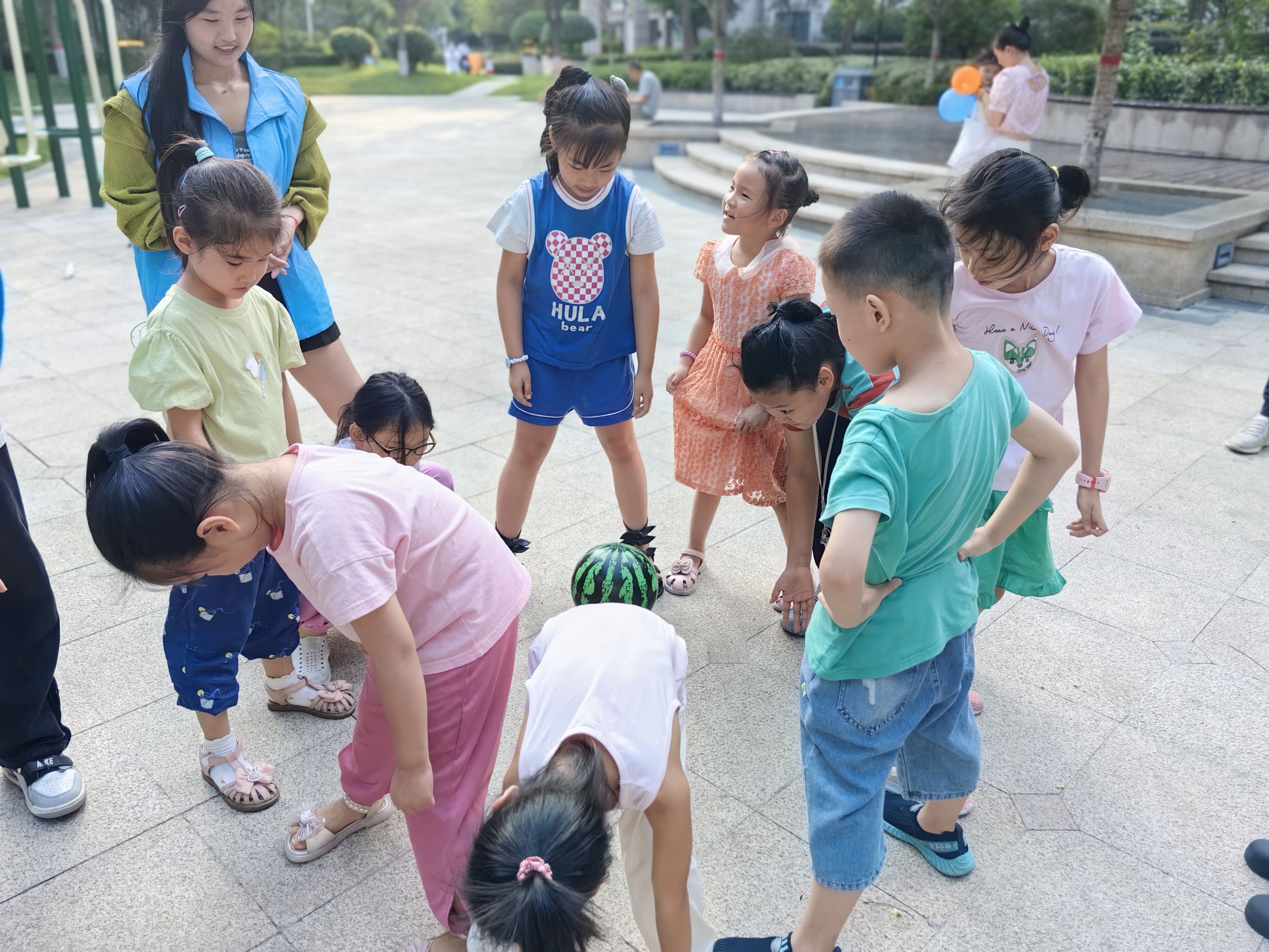 接下来是大象击球游戏。孩子们围成一个圆圈,双腿打开使其之间没有空隙。他们用手臂像大象的鼻子一样击球,球从孩子的腿下经过后需要转过身去继续参加。如果连续两次球从一个孩子的腿下经过,该孩子即被淘汰。志愿者们提前为孩子们演示了游戏规则,孩子们积极参与,展现出了出色的团队合作精神。