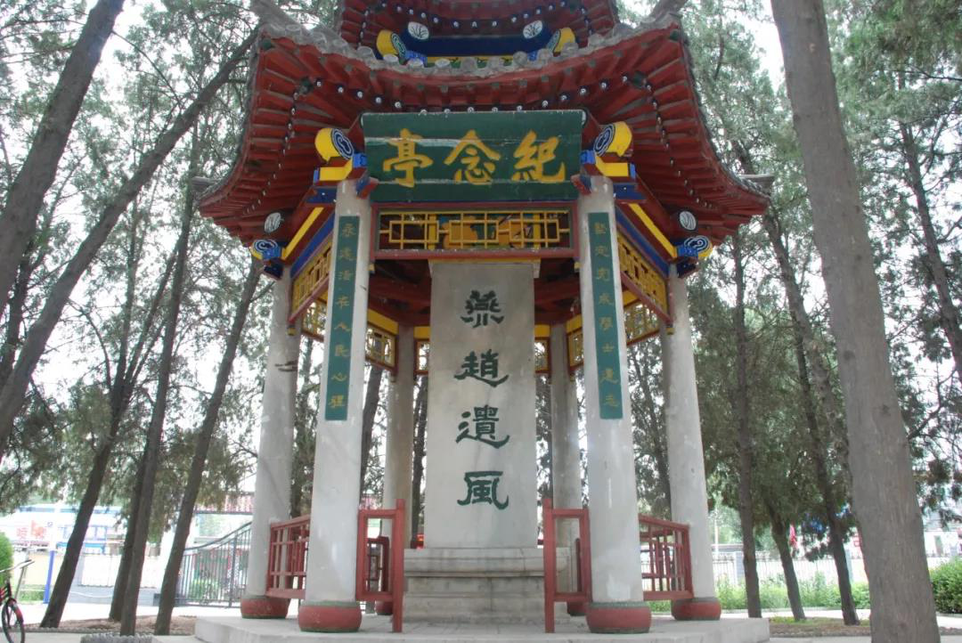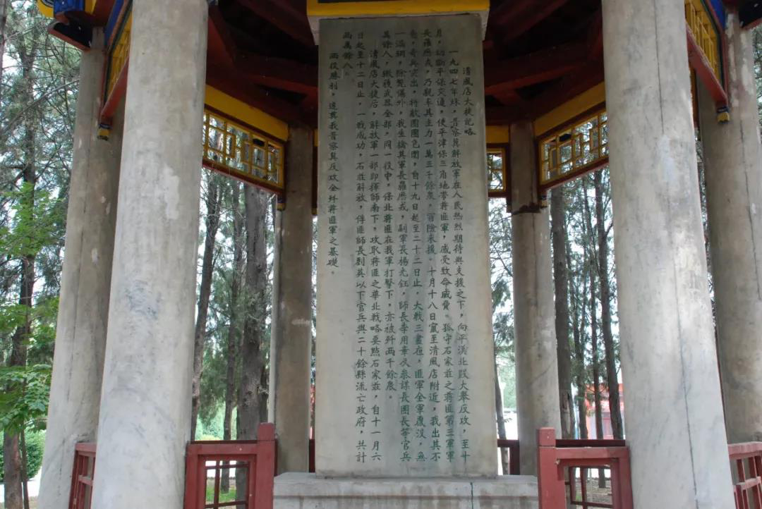 向前走我们可以看到一座纪念亭威严地屹立在历史的巨大背景下。纪念亭以浑厚的青石建成,它高高耸立,屋顶飞檐翘角,展现出古朴而庄重的建筑风格。纪念亭的正面刻有醒目的字体:“燕赵先烈”。这些铭文字迹清晰,仿佛在默默诉说着那段为国家自由和人民幸福而英勇牺牲的历史。登上纪念亭的阶梯,你会看到亭内