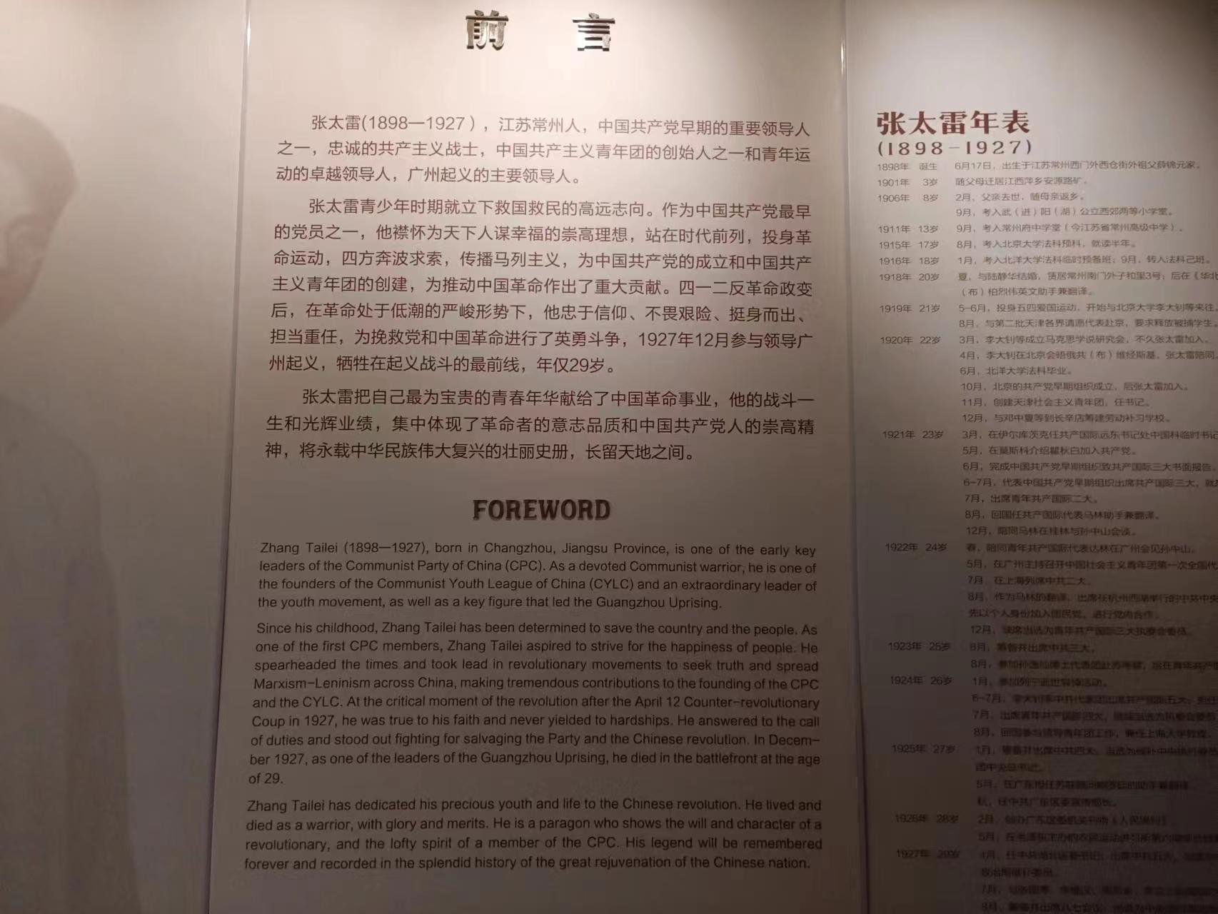 环顾四周,张太雷纪念馆一共两层,第一层呈一个圆弧状,历史的烙印就好像被印在墙壁的两旁,从大厅向左望去,张太雷前辈的生平展示满整个