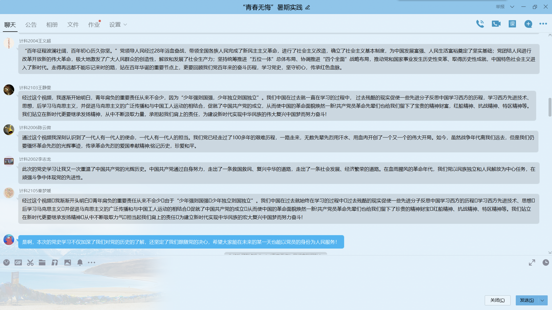 在集体观看纪录片后小组成员在群中发表了观看纪录片后的想法,圆满结束了本次的学习。