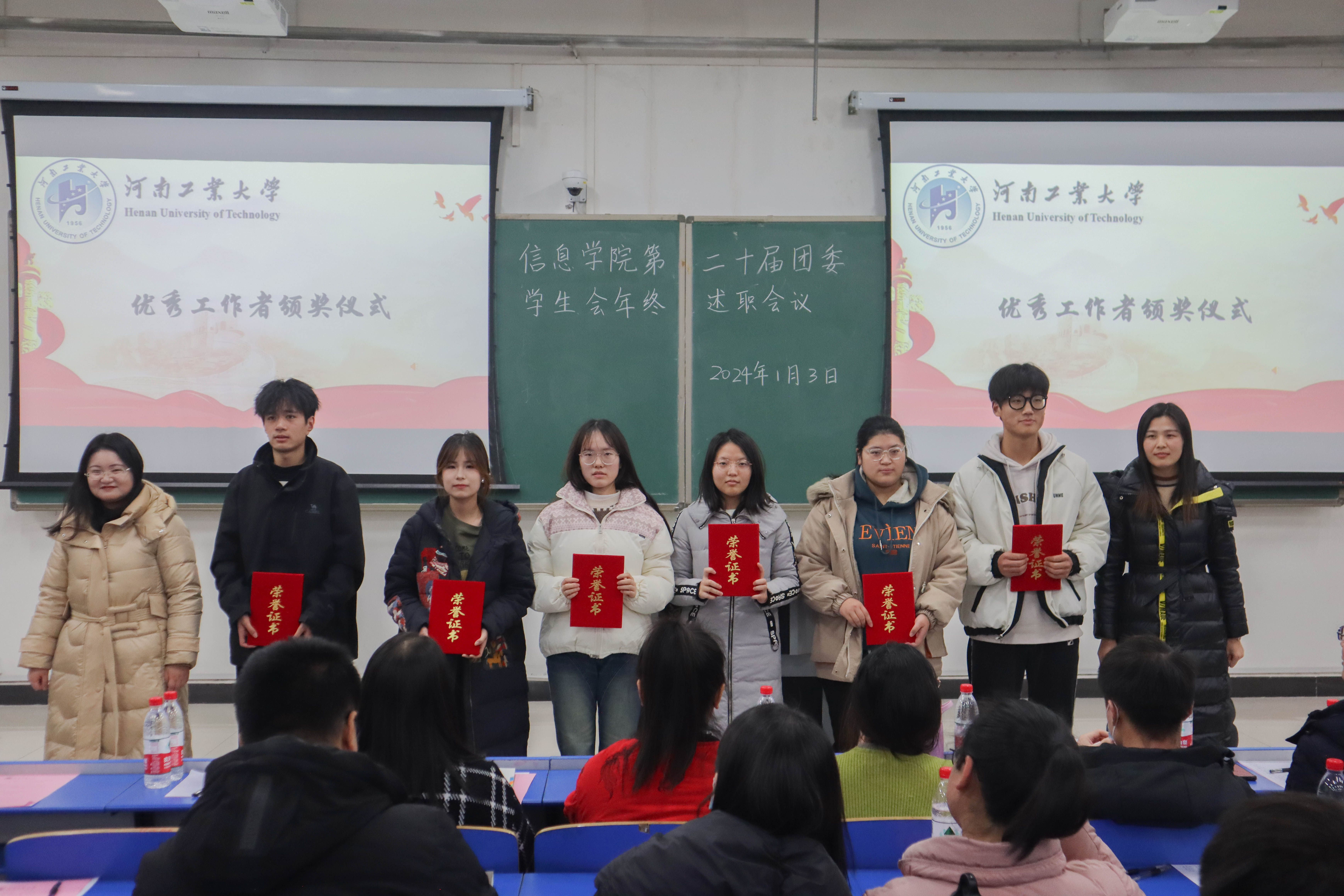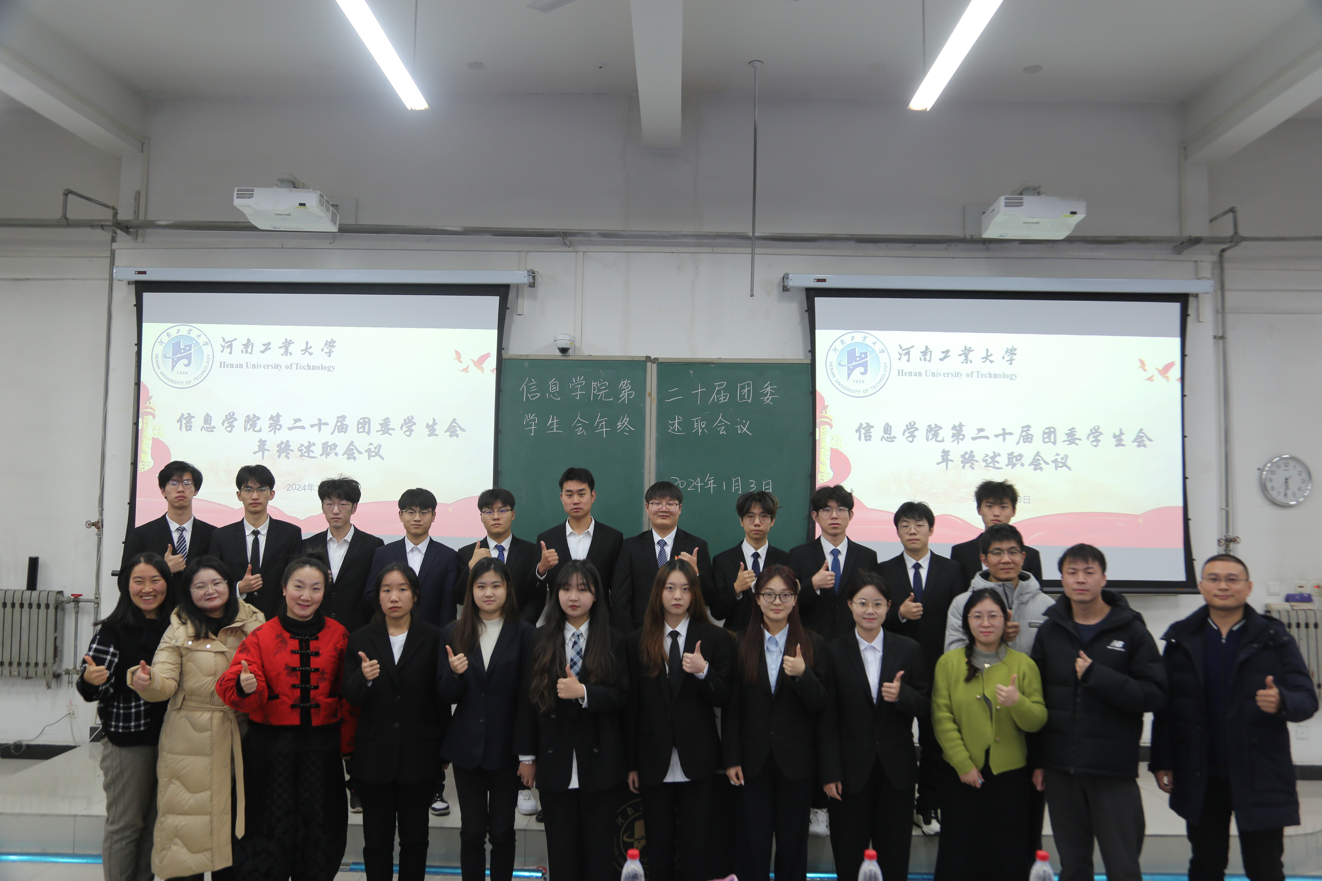 在3135召开第二十届团委学生会年终述职大会暨“青马工程”团学骨干培训班。校正处级组织员鲍庆丹、学院团委书记刘磊、学工办副主任崔莉莎、全体辅导员、第二十届团委学生会成员以及23级学生干部参加本次会议,会议由第二十届团委学生会文策部部长张海榕主持。