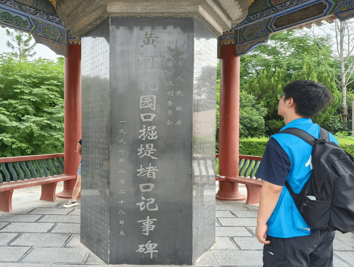 团队成员还参观了东西相望的两座六面碑亭。西侧碑亭是1947年5月花园口堵口成功时国民政府设立的纪念性建筑,上面刻有“济国安澜”“安澜有庆”等题词以及相关工程纪实等内容。东侧的碑亭则是河南省人民政府和黄河水利委员会在 1997年8月所建,详细记录了花园口从扒口到堵口的全过程。成员们驻足碑亭前,仔细研读碑文,仿佛穿越时空,感受着当年的艰难与不易。