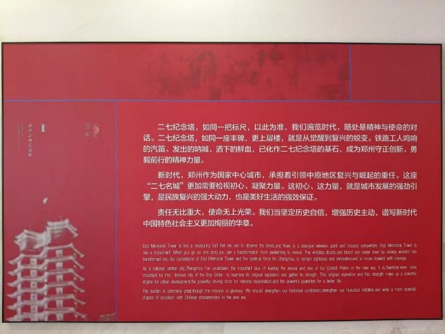 二七纪念塔,这座为纪念京汉铁路工人大罢工而修建的标志性建筑,高耸入云,庄严肃穆。当踏入塔内,一幅幅珍贵的历史照片、一件件真实的文物展品,仿佛带人们回到了那个波澜壮阔的年代。1923年2月4日,在中国共产党的领导下,京汉铁路工人为争取成立总工会的自由和工人阶级的政治权利,举行了震惊中外的大罢工。反动军阀吴佩孚却对罢工工人进行了血腥镇压,造成了“二七”惨案。英勇的铁路工人用生命和鲜血谱写了一曲壮丽的颂歌,他们的英勇事迹和不屈精神让实践团的成员们深受触动。正是无数革命先烈的前赴后继、英勇斗争,才有了如今的幸福生活。站在二七纪念塔下,实践团成员深刻地感受到了肩上的责任与使命,作为新时代的青年,应当继承和发扬“二七精神”,为实现中华民族伟大复兴的中国梦而努力奋斗。