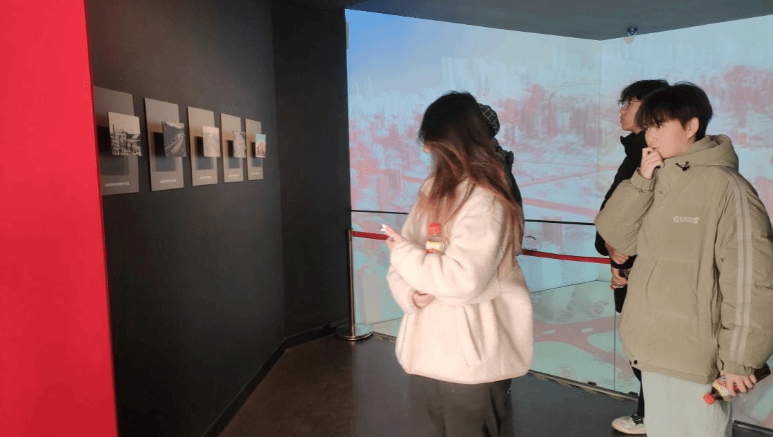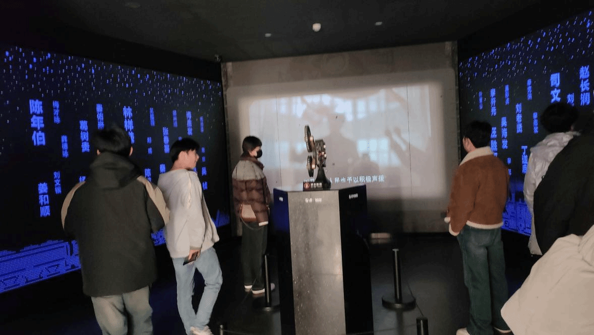 图四:成员们在展览厅内观看纪录片
