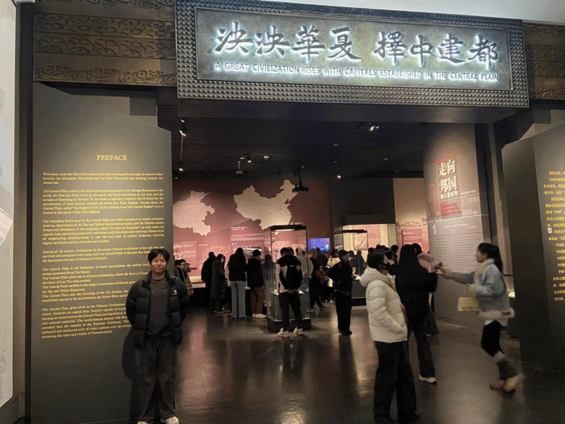 团队成员祝一多在河南博物院的“中原建都”展区驻足良久,认真参观了展馆内关于中原地区历代都城兴衰演变的历史展板。该展区详细展示了自古以来中原大地作为“中华文明摇篮”的重要历史地位,以及历代王朝在此建都的文化和政治背景。展板上呈现的时间轴和地图,让祝一多清晰地感受到中原地区在不同历史时期的重要战略地位及其对华夏文明的深远影响。