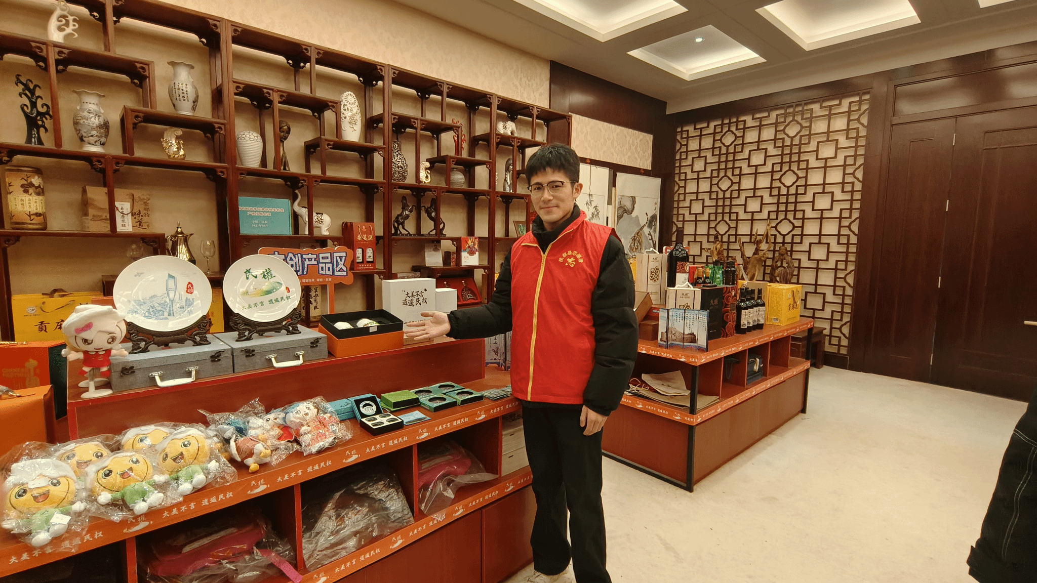 下午,队员们来到文创产品区,积极向游客介绍庄子文化馆周边文创产品。这些文创产品将庄子文化元素与现代设计巧妙融合,无论是精美的书签、富有创意的笔记本,还是造型独特的手工艺品,都蕴含着深厚的文化底蕴。