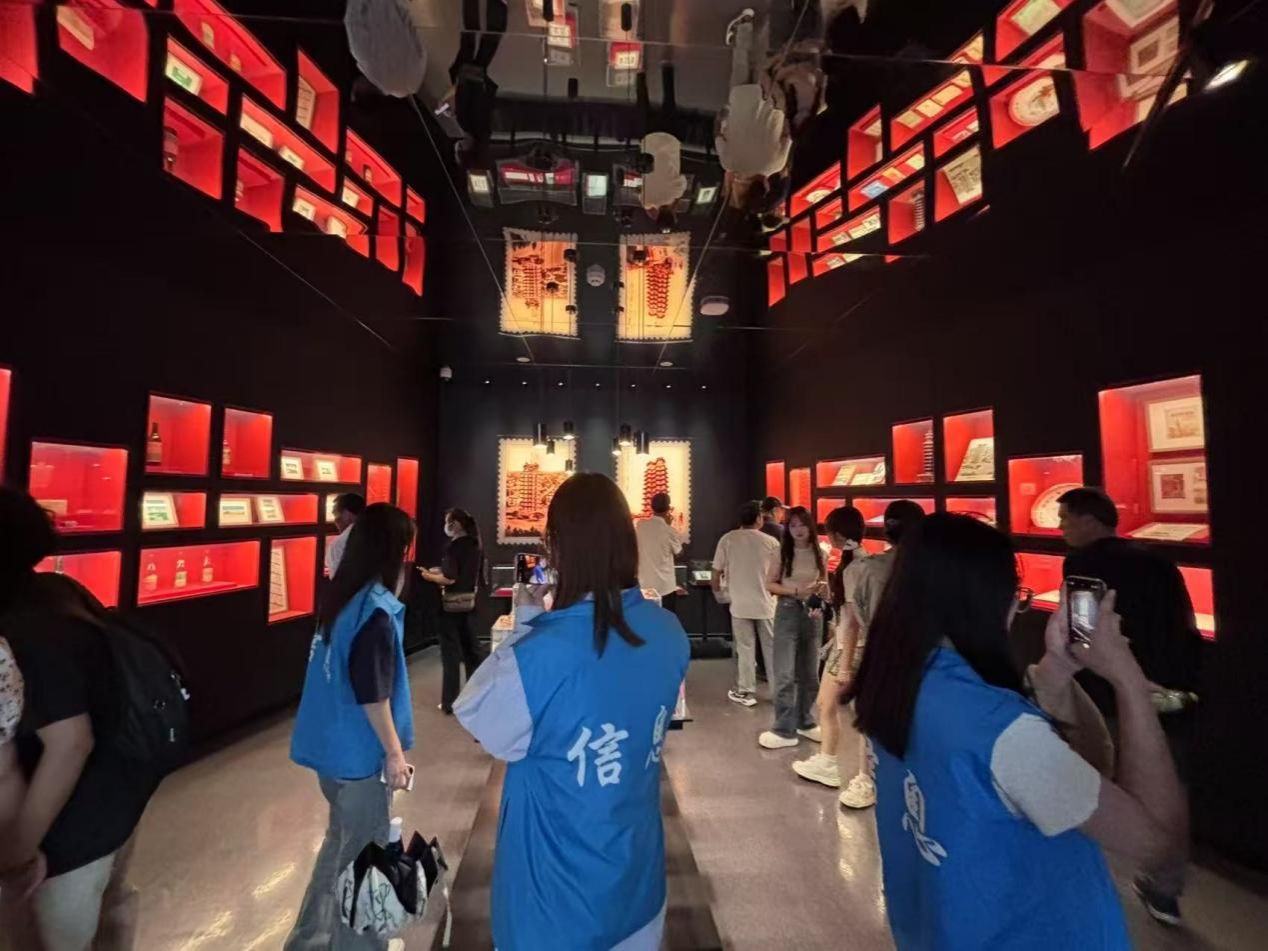 踏入展馆,团队成员们立刻被馆内的陈列所吸引。在以红色为主色调的展厅中,各类珍贵展品有序陈列,从具有年代感的瓶瓶罐罐,到精致的纪念奖章,每一件都承载着独特的故事。成员们认真聆听讲解员的介绍,不时相互交流探讨,眼神中满是对展品背后历史文化的好奇与探索欲。