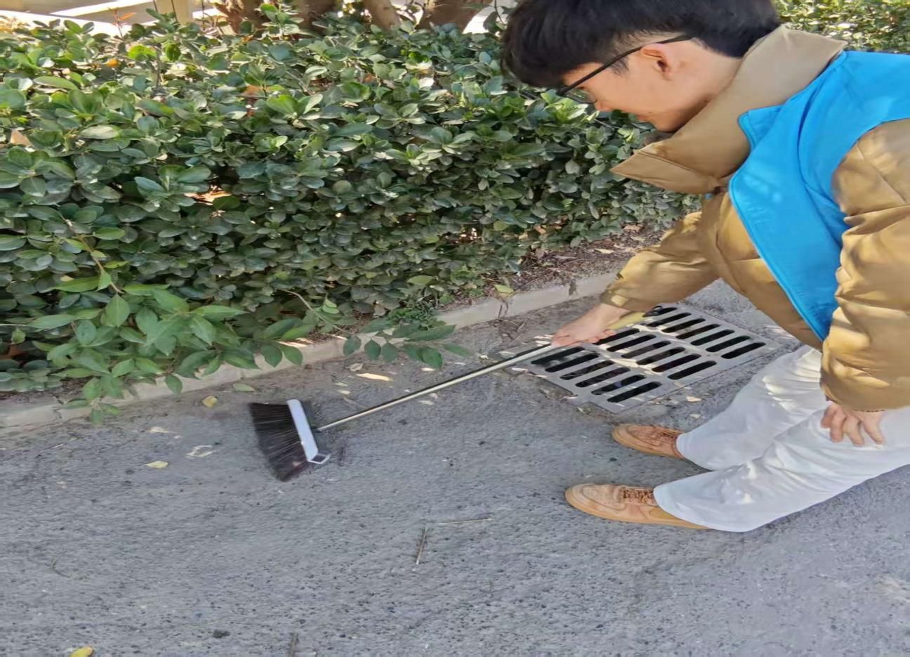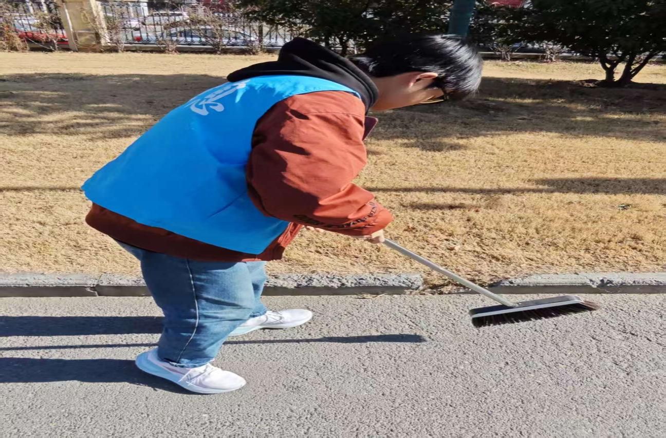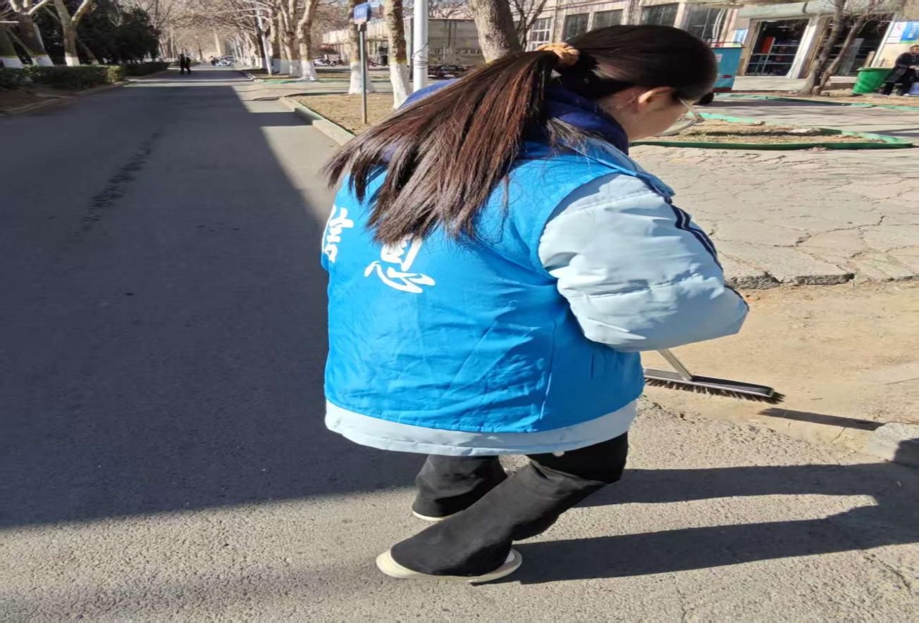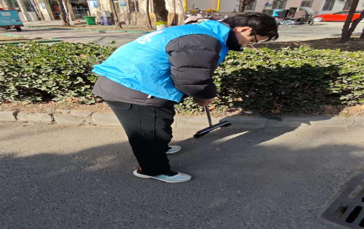 1月18日清晨,4名队员身着统一志愿服,携带扫帚、铁锹、垃圾袋等工具,在当地干部带领下走进朝阳街。作为老商业区,这里商铺密集、人流量大,果皮纸屑、杂草蛛网、绿化带塑料垃圾及墙面“牛皮癣”等问题突出。队员们迅速分工,有的清扫主干道落叶碎石,有的专注剥离墙角电线杆上的顽固小广告,有的钻进绿化带捡拾隐藏垃圾,配合默契高效。