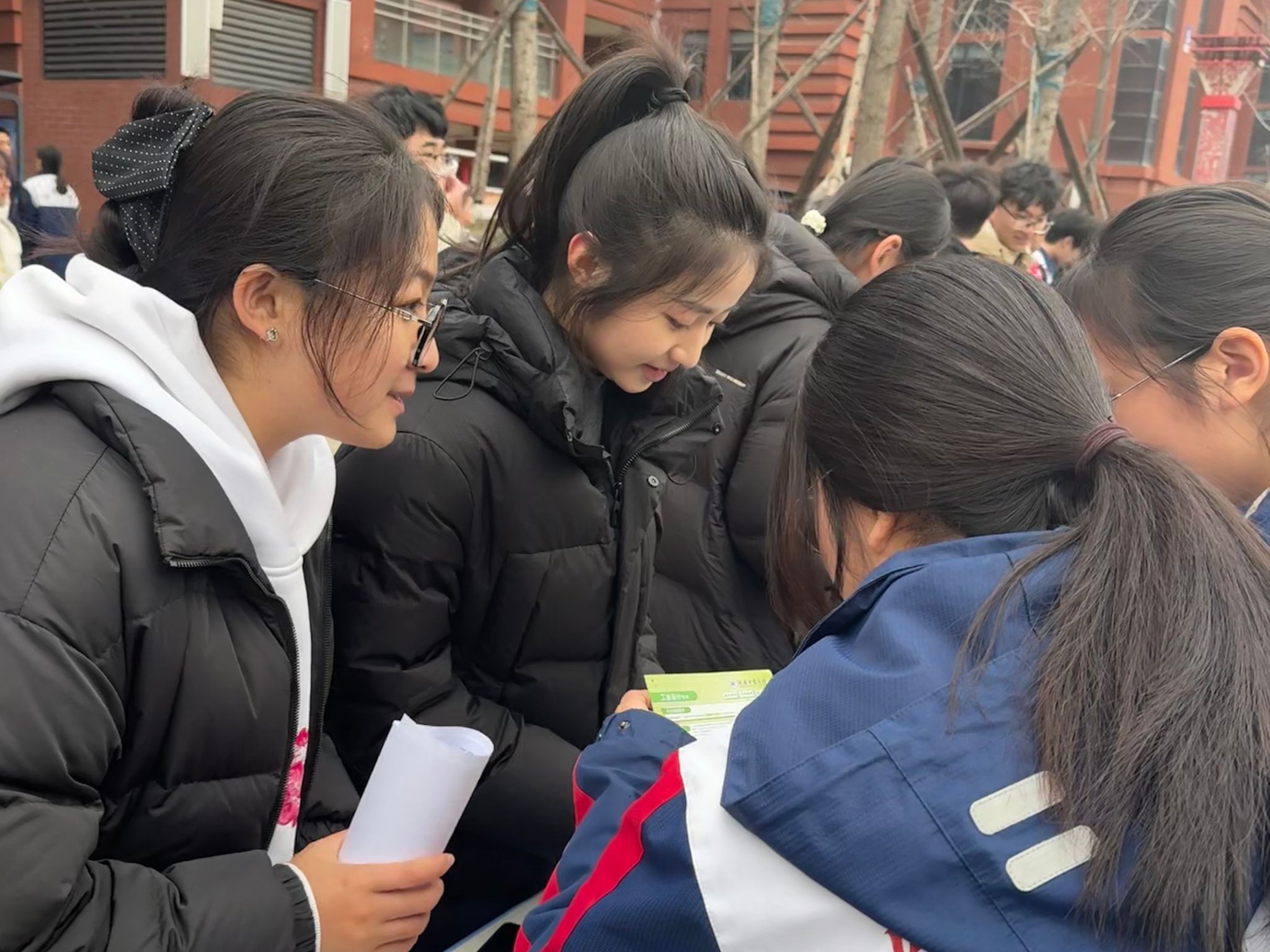 合影结束后,宣讲团迅速前往学校时代广场的指定摊位,快速摆放好提前准备的纸质宣传资料、专业介绍手册等物料,同步做好摊位宣讲的各项准备工作。随着课间休息时间到来,同学们陆续来到时代广场,宣讲摊位前很快聚集了不少咨询者。针对同学们提出的校园生活、专业选择、就业前景等问题,宣讲团成员结合自身经历逐一细致解答,用通俗易懂的语言分享高校学习与生活的真实场景,帮助同学们直观感受大学生活的魅力。