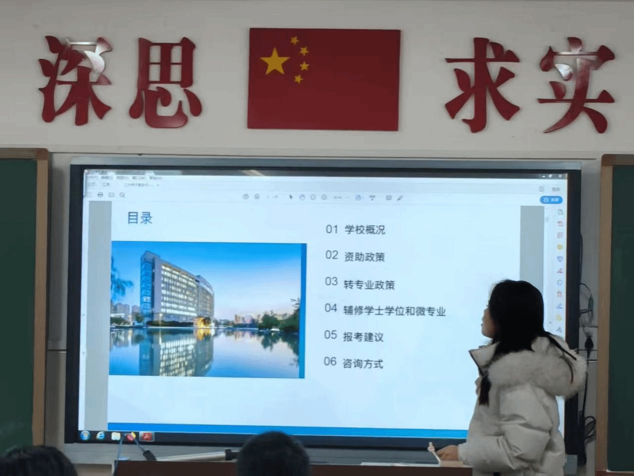 为解决实际顾虑,团队展示政策目录 PPT,重点解读资助政策与转专业政策:“学校设有奖学金、助学金、助学贷款等多元帮扶项目,转专业政策灵活,辅修学士学位和微专业为学业发展提供更多可能。” 清晰的政策框架消除了部分学子对大学费用与学业调整的担忧。