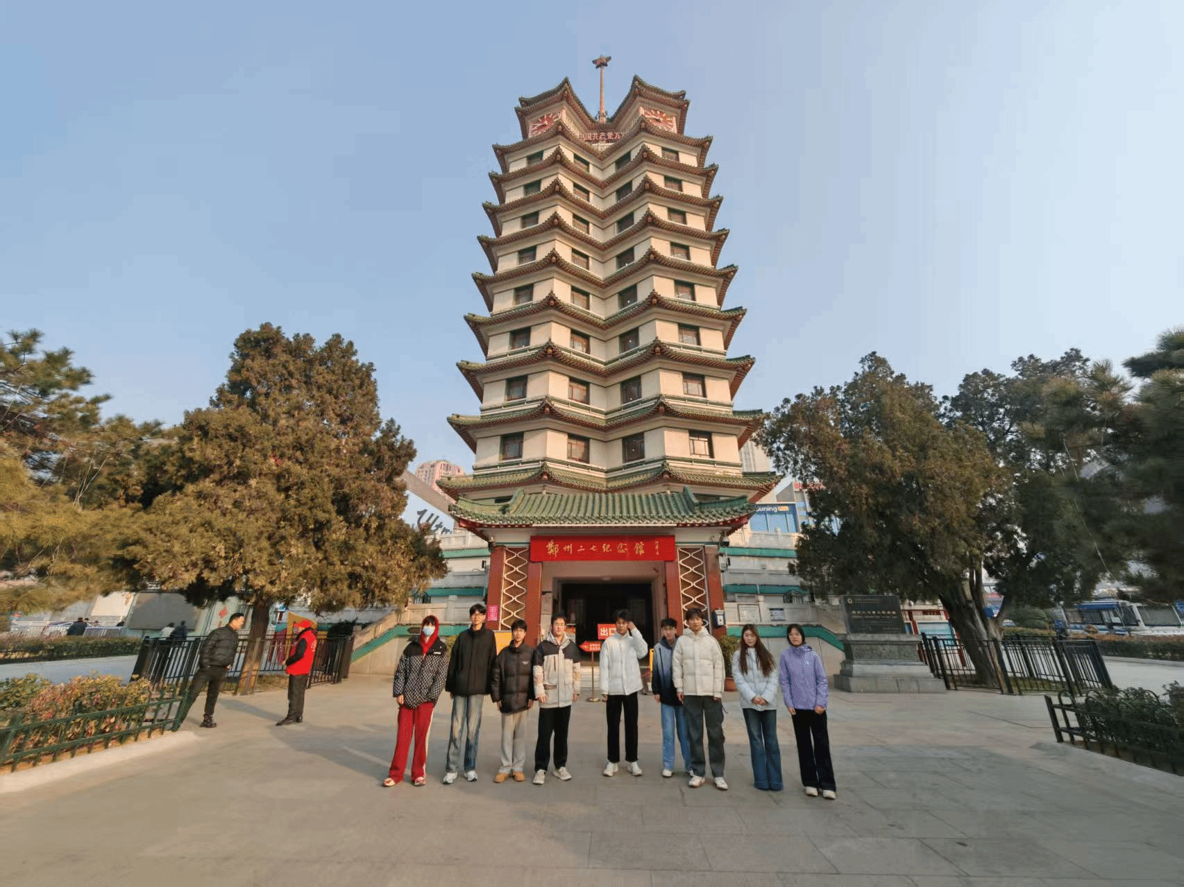 郑州二七纪念塔作为国家二级博物馆,是为纪念1923年京汉铁路工人大罢工而建立的近现代革命旧址类纪念塔,塔内“千秋二七”主题展览通过大量文物、图片和文字资料,生动再现了那段风云激荡的革命岁月。团队抵达后,首先在纪念塔前整齐列队,怀着崇敬之心仰望这座高63米的连体双塔建筑,塔尖红五星在晨光中熠熠生辉,庄严肃穆的氛围让队员们迅速沉静下来。